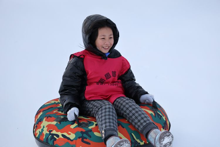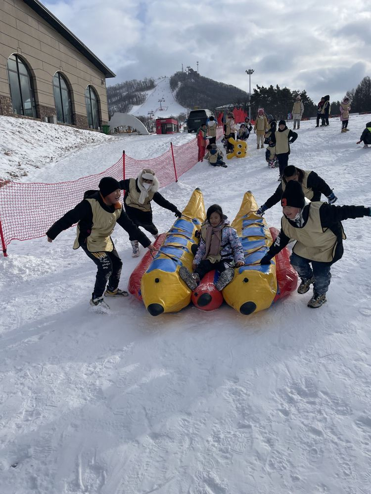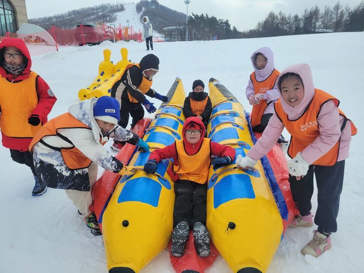 最后同学们进行了雪地香蕉船项目,在教练的指导下,学生们跨上香蕉船,紧抓船上的扶手,顺着雪道滑行,感受雪地坐船的畅快。